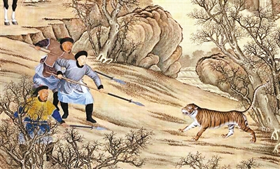 明清时期,老虎的生存状况堪忧,但民间猎取虎骨的行为有增无减,更让人啼笑皆非的是,在一些画作中,皇帝也穿着华丽的服饰,手持钢叉、长矛,装模作样地猎捕老虎。清代的雍正和乾隆皇帝就是这样的“好汉”。