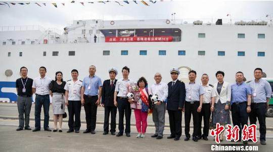 图为:“第20万人次幸运旅客”与中远之星轮合影 陈灵恩 摄