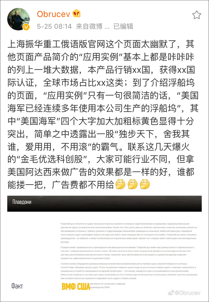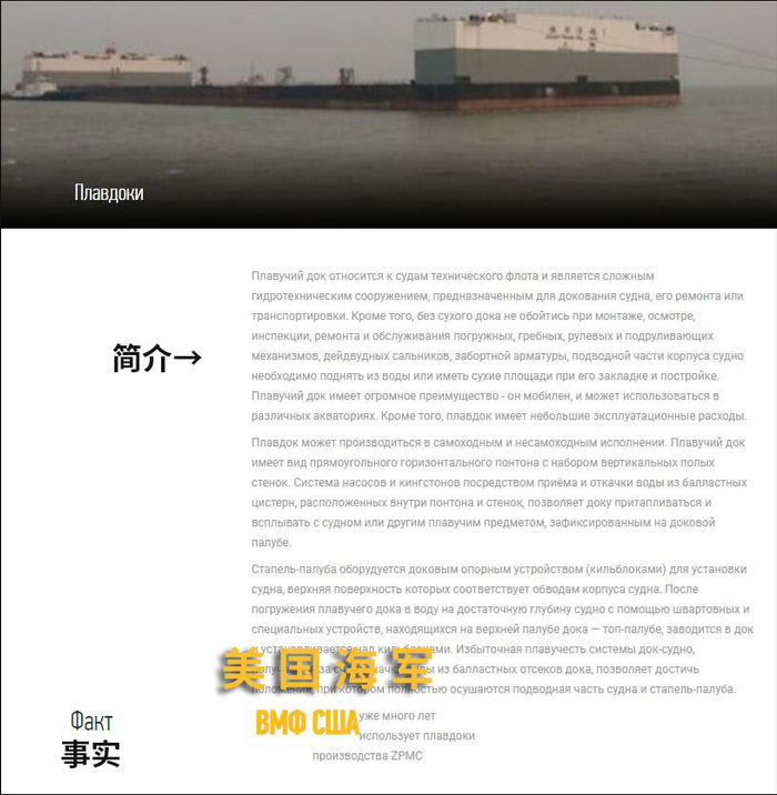 微博用户@Obrucev 在上海振华重工俄语版官网看到,介绍浮船坞的页面上,在三段关于“浮船坞”概况以及简要工作原理的介绍下方,关于振华重工产品的“事实”介绍只有一句话:美国海军已连续多年使用振华重工的浮船坞。