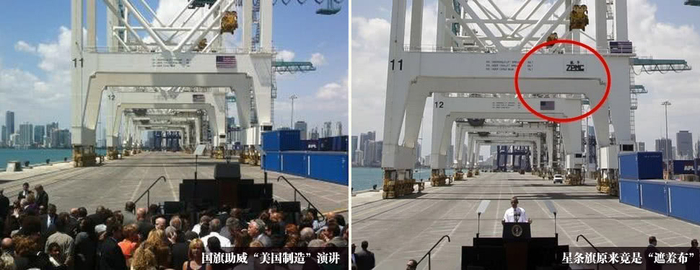 2013年3月29日,奥巴马在美国迈阿密港口发表演讲,突然一阵风将奥巴马身后一辆起重机上的美国国旗吹掉,下面竟然露出了振华重工的商标……