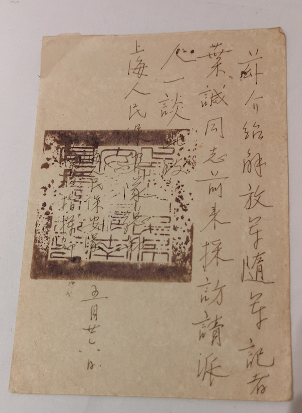 上历博馆藏的记者叶诚的介绍信由叶诚女儿叶沂萌捐赠,是1949年5月27日上海人民保安队沪南指挥部给新华社记者叶诚的介绍信。《解放日报》创刊号第二版刊登有叶诚的采访文章。
