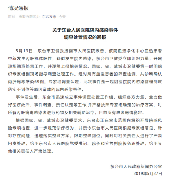 5月27日,东台市政府新闻办发布公告,经对所有血透患者的筛查检测,共诊断确认丙肝病毒感染69例。
