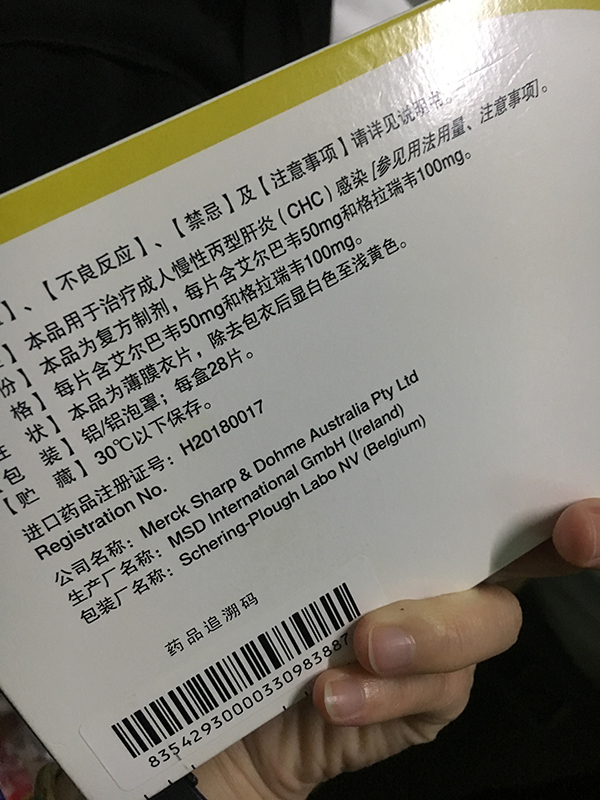 记者看到,医院给患者提供的药物包括去年刚获批上市的默沙东丙肝新药,择必达“艾尔巴韦格拉瑞片”。包装说明显示,该药用于治疗成人慢性丙型肝炎感染。这是一款进口药,患者明细显示,一天的西药费是952元,治疗费为55.6元。