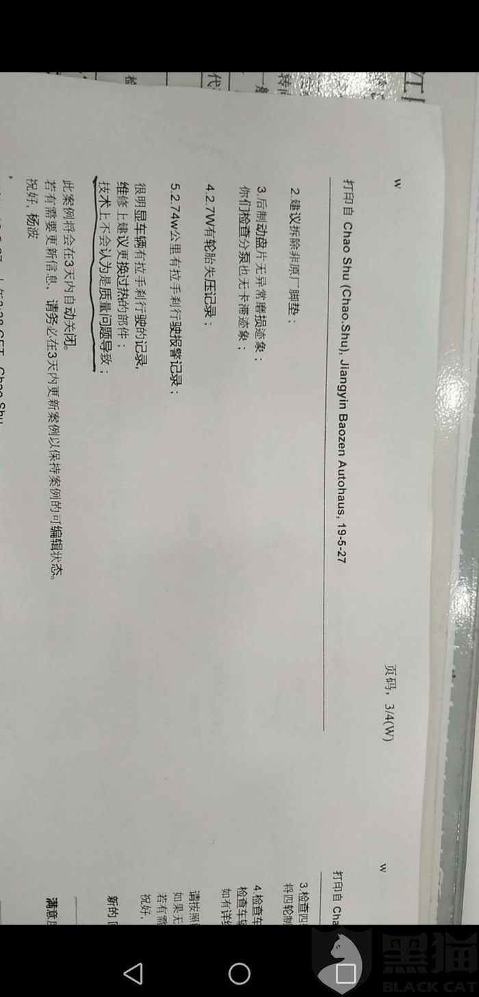 消费者“2179783437”在5月27日向黑猫投诉平台反映:“本人2016年10月购买的宝马迷你(还在保修期范围),在2019年5月18日超市购物后行驶公里左右左后轮自燃,本人用灭火器扑灭,呼叫救援后拖至4S店修理。经过一周排查后宝马中国,发报告要求车主承担所有维修费用。报告中完全无视自己的责任,将全部过错推给车主。汽车质量有以下几点隐患: 1.车辆放手刹不会自动放到底,留一点不明显制动 2.在情况1下,仪表盘不会提示手刹未放,但是行车电脑会记录手刹没放 3.在条件1情况下,行驶5公里左右会导致后轮自燃,有极大安全隐患。 附件图片为宝马中国报告部分内容,以及事故现场后轮扑灭明火后情况。 希望宝马中国承担应有责任义务,不能把所有责任甩锅客户。”