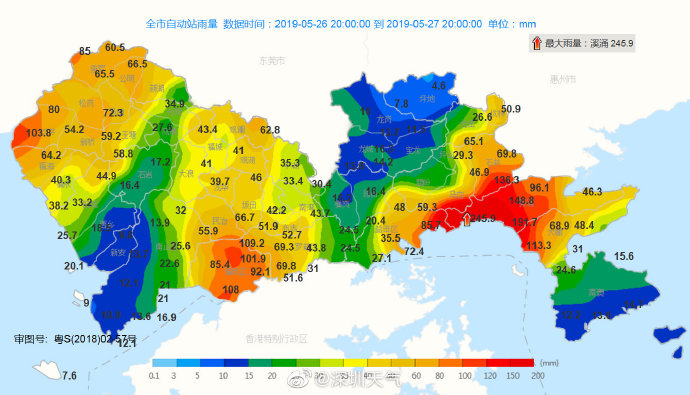 深圳市气象局称,近期深圳市进入新一轮龙舟水降雨期,从昨天夜间开始,受海上不断生成的降雨云系影响,该市出现暴雨,局部大暴雨天气,本次龙舟水降雨过程具有“累计雨量大,短时雨强强,局地差异大”的特征。截至27日08时,全市平均雨量 45.5 毫米,最大累计雨量244.9毫米,最大小时雨量为101.7毫米,均出现在大鹏新区溪涌站。