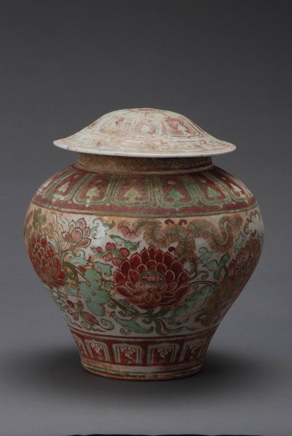 红绿彩莲荷纹盖罐