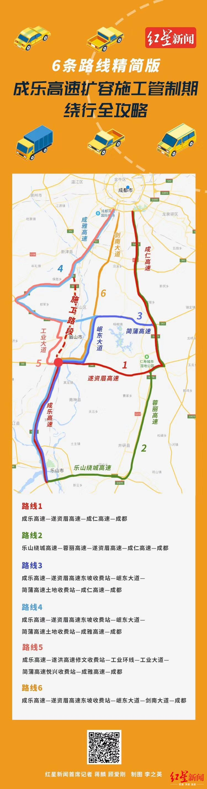 以第一阶段、乐山到成都方向管制为例,交管部门给出了六条绕行路线: