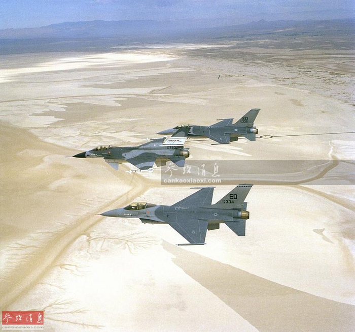 F-16 AFTI后来还试验了包括触摸显示器、语音合成告警等当时最新的航电技术。由于贡献突出,F-16 AFTI团队于1987年9月获得了美空军颁发的科学和工程领域最杰出贡献奖—“西奥多•冯•卡曼奖”。图为2架F-16C与F-16AFTI试验机编队飞行,从垂尾ED代号可看出均隶属于爱德华兹空军基地,本图可对比AFTI试验机与量产型的外形区别。