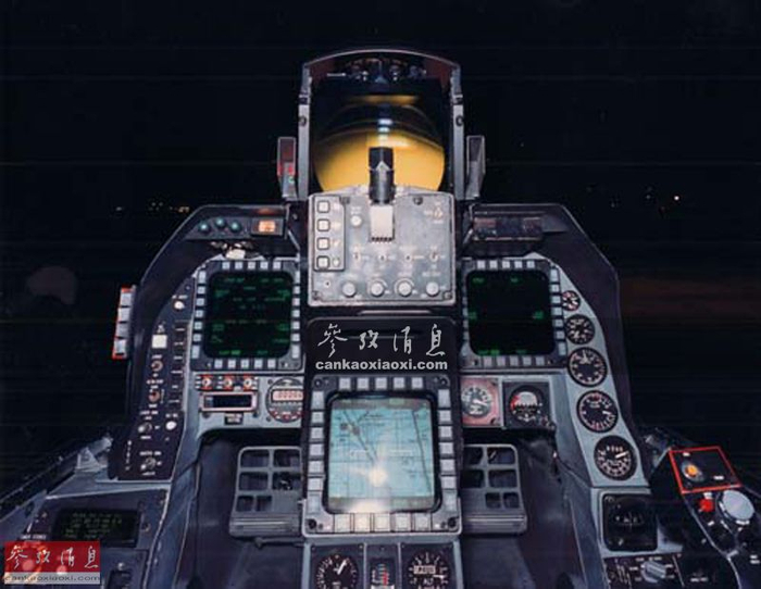 除飞控系统全面提升外,F-16AFTI最大特色之一就是搭载了“语音控制互动设备”(VCID),类似设备直到2003年才在欧洲“台风”战机上投入实用。VCID内存有由256个英语单词组成的词库,飞行员可通过语音直接操控试验机的航电系统。尽管性能有限,但该系统试验效果不俗,识别率达到90%。图为AFTI座舱,可见有3块MFD(多功能显示器),“玻璃化”座舱程度要高于同时期的量产机型。