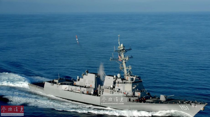 美军伯克级驱逐舰在探测到导弹来袭后,迅速发射了一种名为“纳尔卡”(Nulka)的悬浮式电子干扰诱饵,图中可见诱饵发射升空,和传统诱饵会迅速引爆,形成干扰云不同,这种诱饵更像一架小型无人机,在原地悬停。