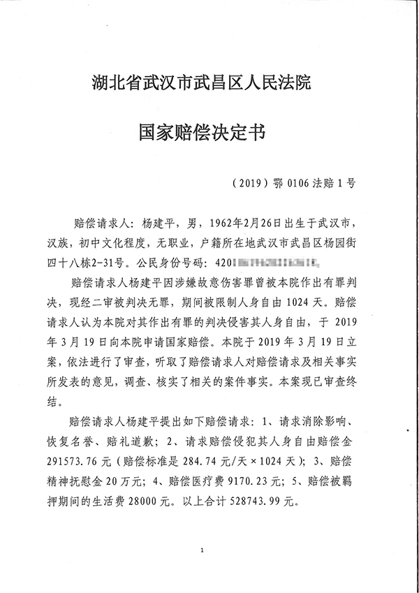 澎湃新闻获得的《国家赔偿决定书》显示,赔偿申请人杨建平因涉嫌故意伤害罪曾被该院作出有罪判决,现经二审判决无罪。杨建平于2019年3月19日向本院申请国家赔偿,该院于当日立案。杨建平提出如下赔偿要求:请求消除影响、恢复名誉权;请求赔偿侵犯其人身自由赔偿金291573.76万元,精神抚慰金20万元,医疗费9170.23元,被羁押期间的生活费28000元。