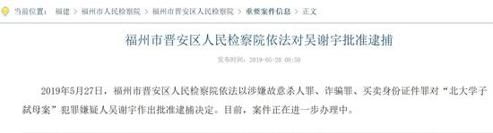 据人民检察院案件信息公开网5月28日消息,2019年5月27日,福州市晋安区人民检察院依法以涉嫌故意杀人罪、诈骗罪、买卖身份证件罪对“北大学子弑母案”犯罪嫌疑人吴谢宇作出批准逮捕决定。目前,案件正在进一步办理中。