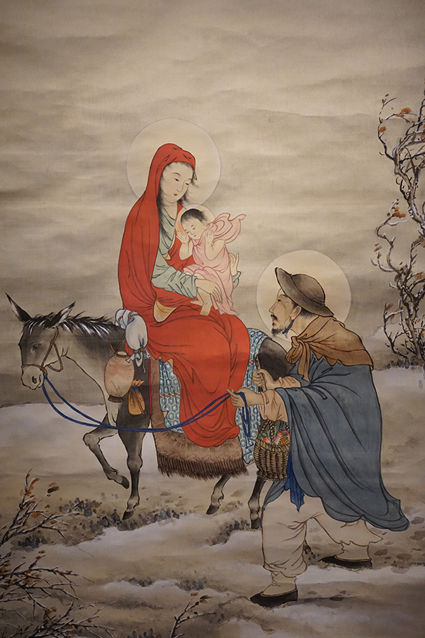 本次展览中还有一幅画中人物着中国传统装束的同主题作品展出。即画师任懿芳画的《逃往埃及图》。这幅画描绘的也是圣家庭(圣约瑟、圣母玛丽亚和圣婴耶稣)从伯利恒起身逃往埃及的情形。画旁落款:任懿芳恭绘。钤印:懿芳及“天主圣母,为我等祈”。