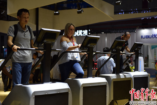 观众在体博会上体验智能跑步机。中国青年报·中青在线记者 慈鑫/摄