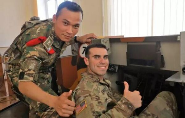 在对乌首都塔什干的一座坦克指挥学院访问期间,美军校学员进入该校模拟训练室,在乌方学员代表指导下,轮流上手体验了一把各型乌军现役战车的模拟驾驶。