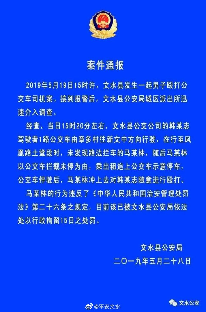 据@平安文水 5月29日通报,2019年5月19日15时许,文水县发生一起男子殴打公交车司机案。接到报警后,文水县公安局城区派出所迅速介入调查。