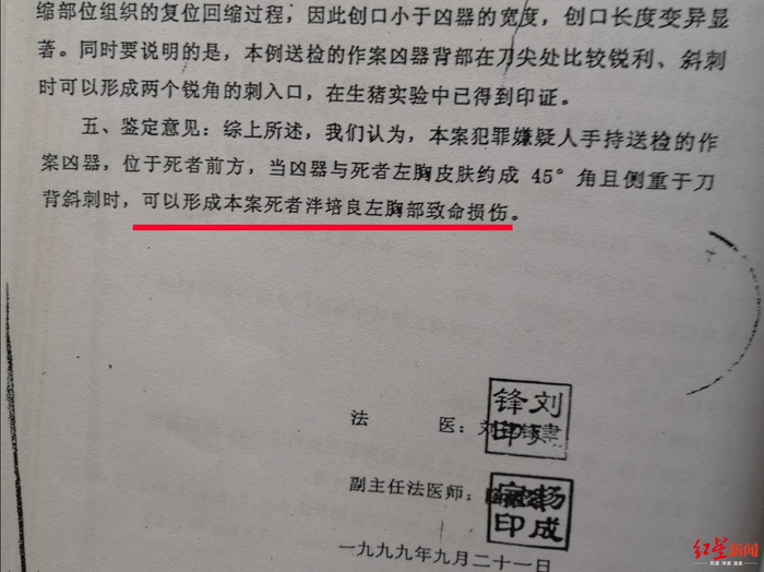 《鉴定意见》分析称,选择生猪胸部作实验,是由于它与人体相类似,组织有弹性,在生存状态下实验,更接近于实际案件中的被害者,生活反应强烈。