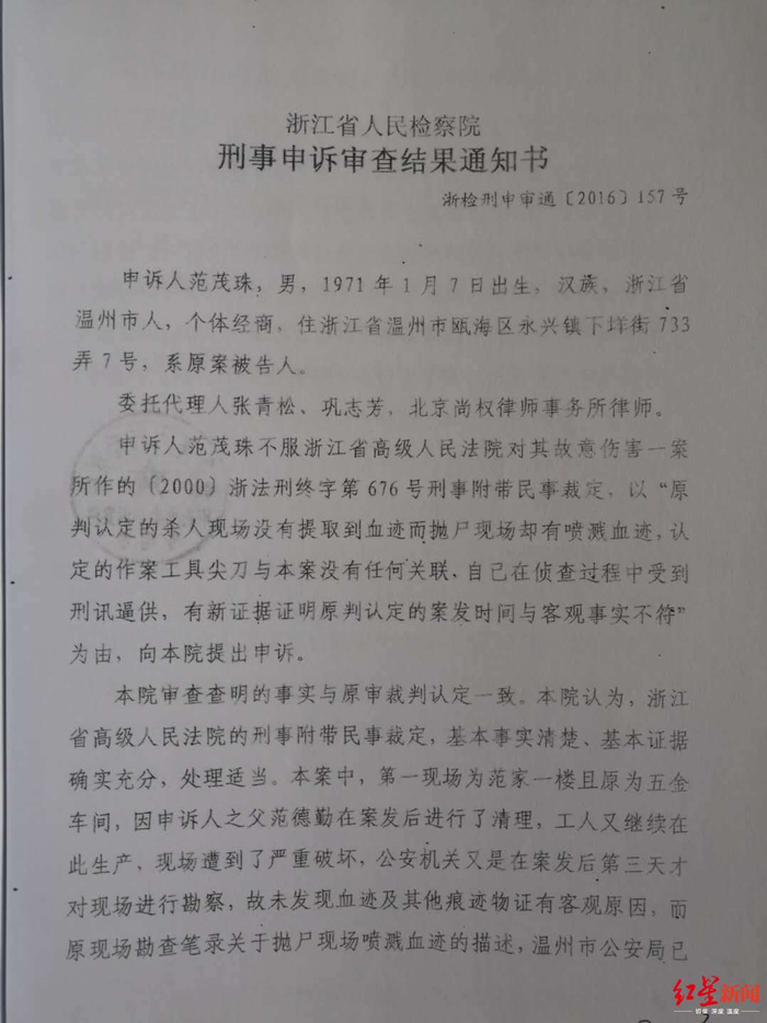 ↑浙江省检察院称范茂珠的申诉不能成立