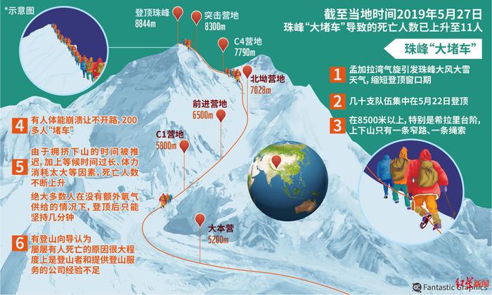 ↑图表:珠峰“大堵车”导致死亡人数上升至11人。图据东方IC