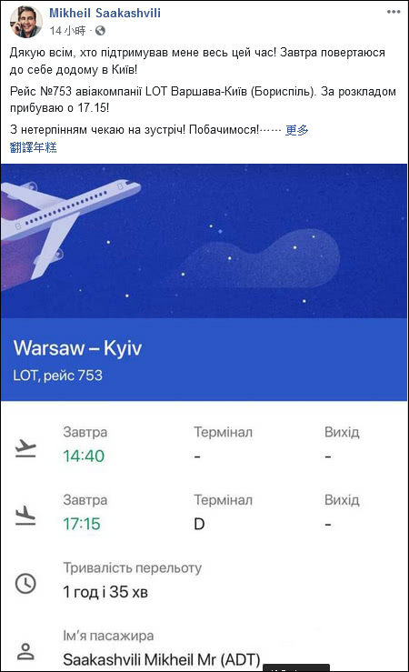 当天,萨卡什维利在其脸书账号晒出29日从华沙飞往基辅的机票,并写道:“感谢所有支持我的人,明天我将回到基辅的家!”