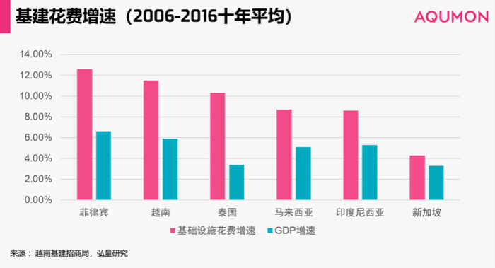 如果用基础设施花费的增速来衡量一个国家对基建的重视程度,我们可以看出,越南在逐步加大对基础建设的投入。越南的基建花费增速达到了11.5%,约为GDP增速的两倍。