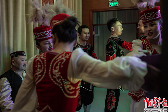 可可托海干部学院,哈萨克族演员在演出前候场。这里是新疆维吾尔自治区干部红色教育基地。
