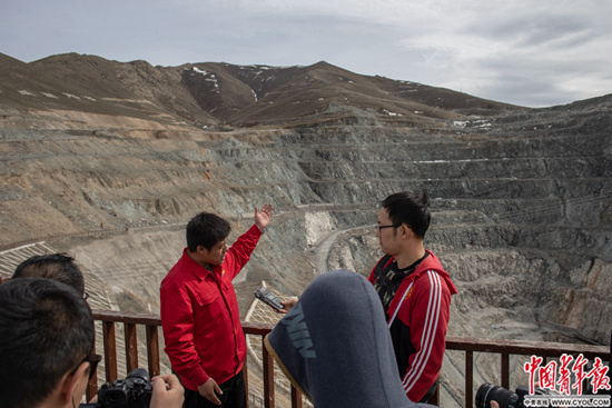 可可托海国家矿山公园景区3号矿脉露天矿坑前,矿区企业的讲解员接受采访。