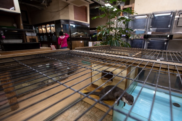 日本一家水獭咖啡馆内,微小的浅水池,小型围栏,每天与数百名客人进行不自然的互动。