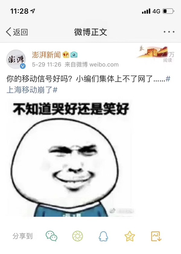 记者随后了解到,上海移动官网发布:5月29日11:10左右,上海移动网络出现异常,部分用户业务体验受到影响,经应急处理,在11:20左右上网业务全部恢复,目前少量用户的语音通话受影响,正逐步恢复中。