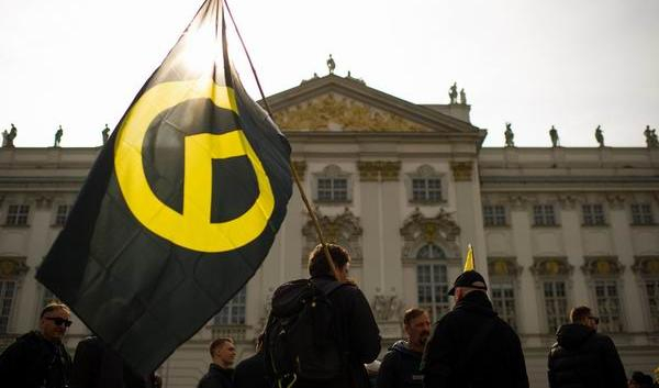 2019年4月13日,奥地利维也纳,极右翼举着“身份主义运动”标识的旗子集会