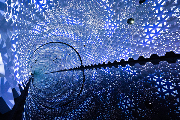 在《鲸》这件装置中,上百个发光的六角形元件代表神经元集群网络的振荡活动。神经元间的反馈连接激起振荡,起到同步神经元放电模式的作用。每个六角单元在无尽隧道中的反应都不尽相同,随鲸之颂接连颤动。