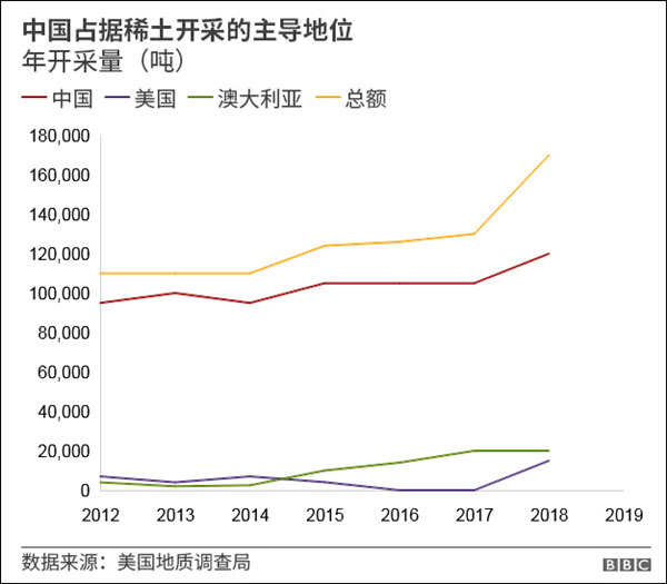英国广播公司(BBC)报道,2018年,美国国防部在回答特朗普一份总统令时,呈交一份报告警告说:美国国防系统对中国稀土依赖程度巨大。