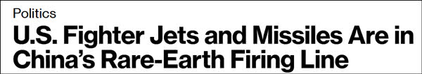 彭博社29日刊文称,美国的战机和导弹都在中国的稀土“火线”上,“从洛克希德马丁的F35战机,到制导导弹和用于确定目标的激光,一切都依赖稀土元素来执行关键功能。中国稀土产量占全球的95%,而美国80%的稀土需求依赖这个亚洲国家。”