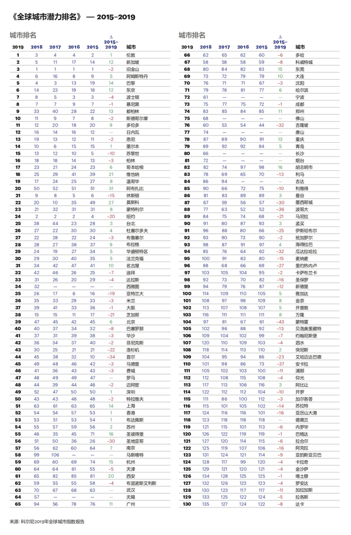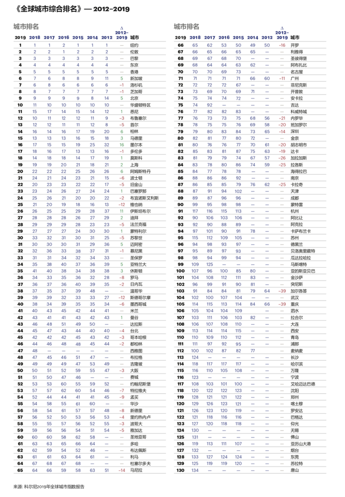 《2019全球城市指数报告》包括《全球城市综合排名》和《全球城市潜力排名》,两份榜单对全球130个城市进行排名,其中中国城市共26个,分别评估了当前世界顶级城市的表现和未来城市的发展潜力。今年纽约和伦敦保持了其在《全球城市综合排名》中的领先地位,但这项研究也显示,即使是世界领先的城市也应随时保持警惕以防被赶超。