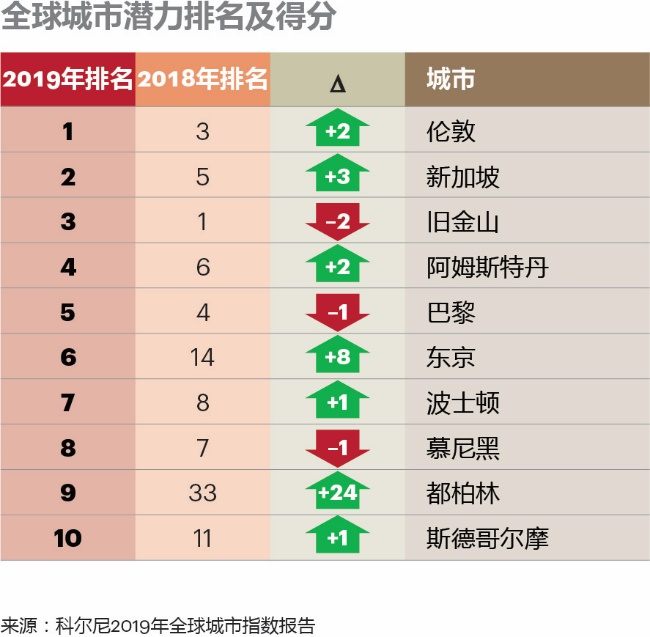 《全球城市潜力排名》评选出可与老牌城市相媲美的新兴城市。伦敦得益于其稳定的发展步伐,今年跃居榜首。在连续四年荣登潜力排行榜榜首后,旧金山今年跌至第三位,虽然其在创新方面仍得分靠前,但在居民幸福感和治理等方面的表现被其他领先城市赶超。