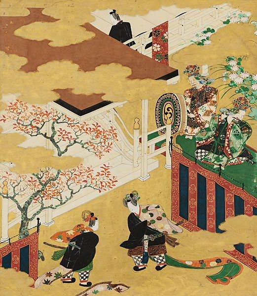 在《源氏物语》问世的一个世纪之内,日本艺术家纷纷迎接这部史诗所带来的挑战,他们在《源氏物语》画册、手卷、立轴、大型屏风上赋予故事以视觉形态。在此次大都会的展览中,我们能够看到日本的“图像感性”是如何产生的:比如与精细的建筑图以及让室内外具有同样可视性的被掀起的屋顶(源氏就常常从外面窥视内部)。金箔似的低垂的云层突出了空中的景色,它们仿佛阻止了某些行动的发生,又给画面增添了装饰性。