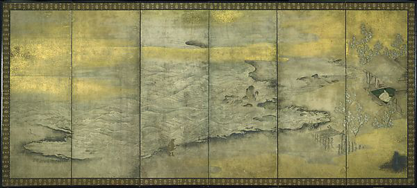 而在另一面16世纪末的屏风上,一场暴风雨显而易见,画面被巨龙般卷曲的浪花占据,我们的主角则勇敢地坐在海岸边一块小小的庇护地上。紧接着,在岩佐又兵卫(1578-1650)的一幅17世纪早期手卷中,结构成为了重点,源氏迎风站立,他身上的和服在风中飘动。