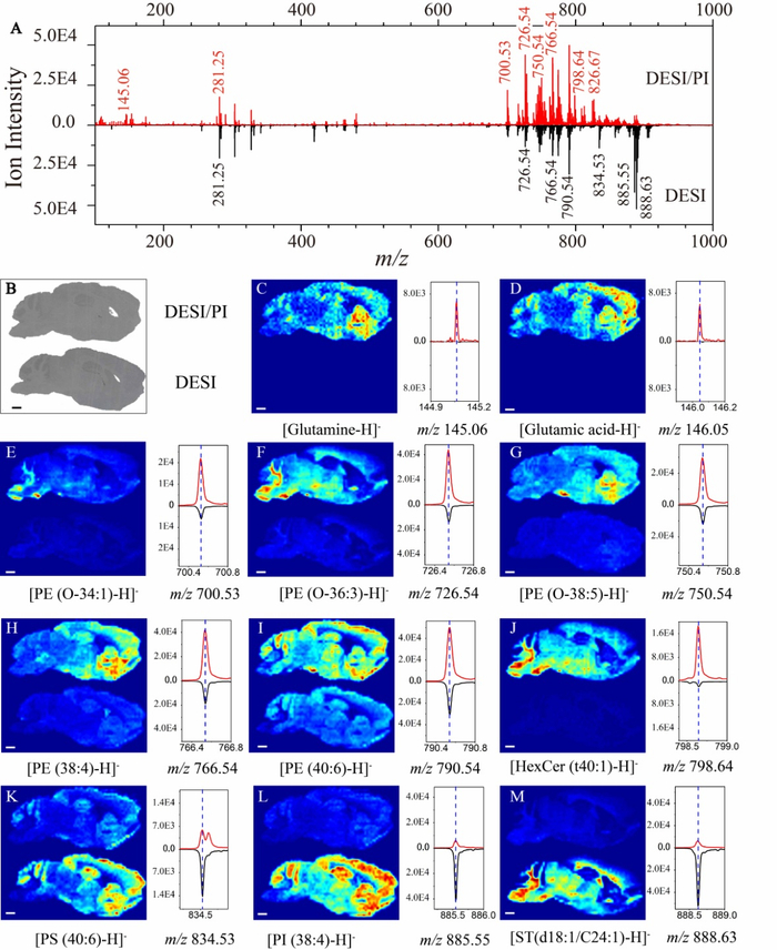 图2. 负离子模式下DESI-MSI和DESI-PI-MSI获得小鼠脑组织切片质谱和成像图