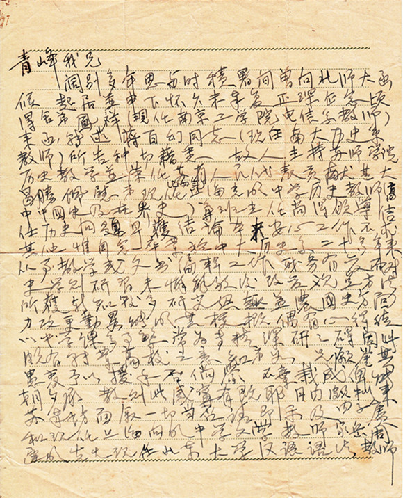 阔别多年,思与时积。暑间曾向北师大函候起居并申下怀,久未奉复。正深企念,顷得舍弟凤祥(现任南京工学院电信系教师)来函转述蒋百幻同志(现任南大历史系教师)所告种,却藉悉故人主持苏师学院历史教学并荣任苏省人民代表,贡献甚大,曷胜佩慰!弟现任(已四年)上海光明中学历史教师(高中中国史及世界史)兼班主任,尚得领导信任,历史问题早获结论。本来安心工作,不求其他,惟自念卒业于中大历史系,二十多年来从事教学或文书编辑工作,职务有变,而对史学则研习未懈。解放后改变观点方法,所获新知较多,研究兴趣益浓。国史方面,力攻更勤,略能明其梗概,偶有心得。徒以中学课多事繁,常为专精深研之碍,因此颇有转业高校之意。知弟如兄,愿鉴其愚衷,予以援手否?倘蒙不弃栽成,俾能朝夕承教,则此感宁有既耶。月内颇拟来苏奉访,面叙一切,当否?请即示及。内子赓和现任上海向明中学文学教师,家岳周遵明先生现任山东大学汉语语法教师[后阙]。