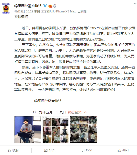 5月29日晚,绵阳市公安局网络安全保卫支队官方微博@绵阳网警巡查执法发布警情通报称,原籍绵阳江油的成都某大学的大二学生温某在新浪微博平台多次发布侮辱军人信息。