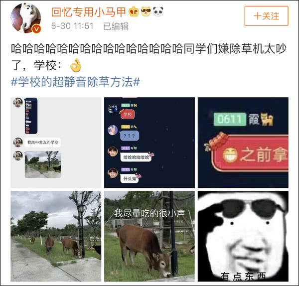 点开以后发现,说的是某校的学生因为觉得除草机除草的声音太吵,于是校方整来了一堆牛,“静音”除草。
