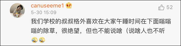 这名投稿网友称,因为某校学生觉得除草机除草的声音太吵,尊重学生不满意见的校方,做出了一个脑回路无比奇特的“骚”操作。