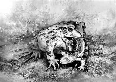 格尼蛙吞食诺敏螈生态复原图(绘图/张宗达)