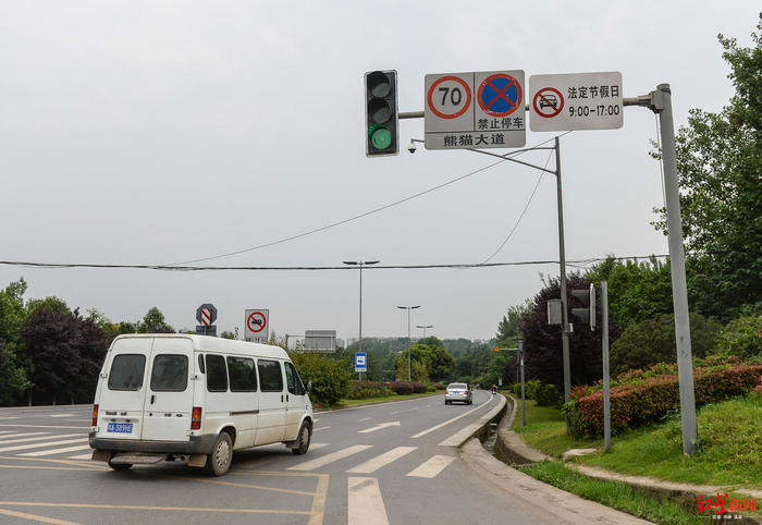 为有效分离基地景区交通与过境交通,节假日期间每日9时至17时,执勤交警在熊猫大道实施交通分流,引导过境车辆利用新建道路绕行,疏解景区路网的交通压力。