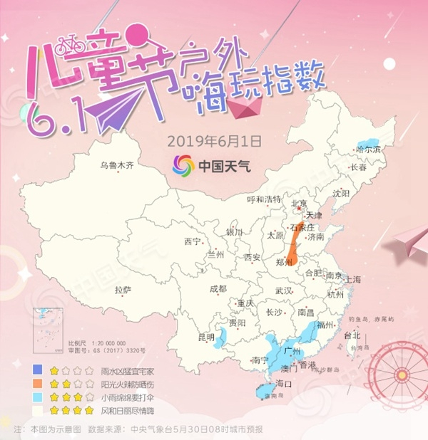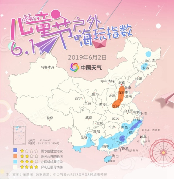6月1日,儿童节当天,我国几乎九成以上的地区都是适宜户外游玩的好天气,嗨玩指数四颗星,大家可以尽情的出门HIGH了。