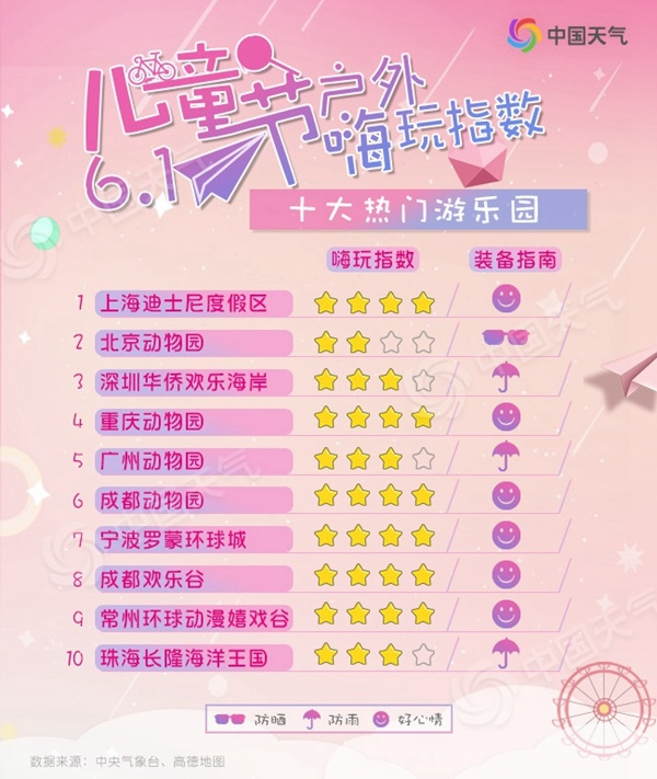 根据预测,儿童节期间,位于华南的深圳华侨欢乐海岸、广州动物园、珠海长隆海洋王国都会受到降水的影响,去游玩的话要记得携带雨具。位于华北的北京动物园天气晴热,紫外线强,出游要做好防晒措施。