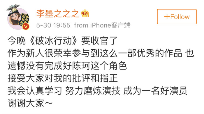 同日,自播出以来一直备受争议的陈珂一角的扮演者@李墨之之之 也在电视剧收官之际发文作出回应,称“遗憾没有完成好陈珂这个角色,接受大家对我的批评和指正 ”。