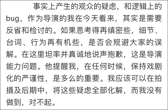 但@傅东育 仍对于观众的疑虑和逻辑上的bug道歉,并表示如果思考得再缜密些,也许会规避大家的误解,“在这里坦率并真诚地说声抱歉,这是导演能力问题,”@傅东育 补充道,“我应该可以在拍摄及后期中,将这些疑虑全部化解,而我没有做到,对不起。”
