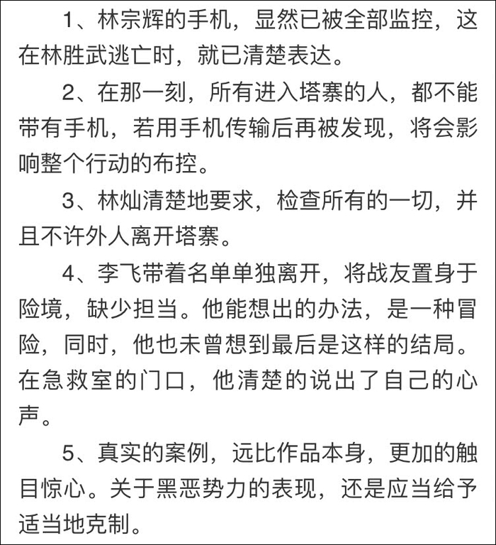 对于第45、46集中,马雯的负伤、李飞进入塔寨之后的抉择,以及林宗辉名单传输的方式造成的争议,@傅东育 给出了几点说明,并表示“真实的案例,远比作品本身,更加的触目惊心。关于黑恶势力的表现,还是应当给予适当地克制”。