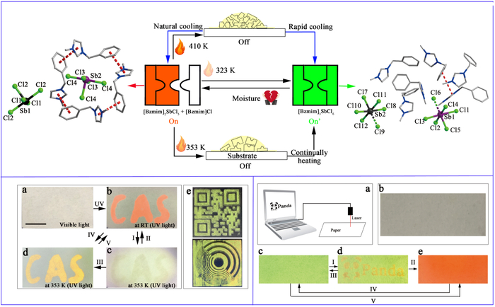 为了获得新型热刺激响应材料,中国科学院福建物质结构研究所结构化学国家重点实验室研究员黄小荥领导的课题组设想采用具有柔性有机阳离子的离子液体,结合具有ns2电子构型的主族Sb(III)离子对卤素X的配位构型多变的特点([SbX-4]-、[SbX-5]2-和[SbX-6]3-),通过外界刺激来调控X-与Sb(III)的配位数的变化,实现对杂化卤化物结构中阴离子的结构和阴阳离子之间的比例的调控,从而实现材料荧光随外界刺激的应变。基于此设想,他们将Sb与离子液体[Bzmim]Cl(1-苄基-3-甲基咪唑氯盐)结合,得到了无机-有机杂化金属卤化物[Bzmim]n-3SbCln (n = 6 for 1 and 5 for 2)。其中[Bzmim]3SbCl6具有绿光发射(量子产率87.5%),[Bzmim]2SbCl5在不同波长光激发下具有红光和蓝光发射。有趣的是,离子液体[Bzmim]Cl可以在特定的刺激下在该体系两个结构中进行可逆的析出和插入,相应地实现红光和绿光的转换。由于两者熔点的明显差异(1的熔点为410K,2的熔点为348K),当2熔化而荧光淬灭时,1仍然处于固体状态而会产生荧光,在过量ILs存在的情况下,加热IL@2会发生荧光先淬灭,而后通过反应生成1而重新产生新的荧光的现象,从而得到新颖的“开-关-开”的荧光转变模式,这在热刺激响应型荧光材料中属于首次报道。而两个晶体之间存在的热力学结晶和动力学结晶过程的竞争,使得过量的ILs可以通过控制冷却过程来产生。此外,将这类材料和纸张结合起来,还可以实现“可重复书写荧光纸”的制备,该书写过程可以通过激光来完成,而无需像其他可重复书写纸张中那样需要使用墨水或者模板。上述结果发表在《德国应用化学》(Angewandte Chemie International Edition,DOI: 10.1002/anie.201903945),文章的第一作者是王泽平。